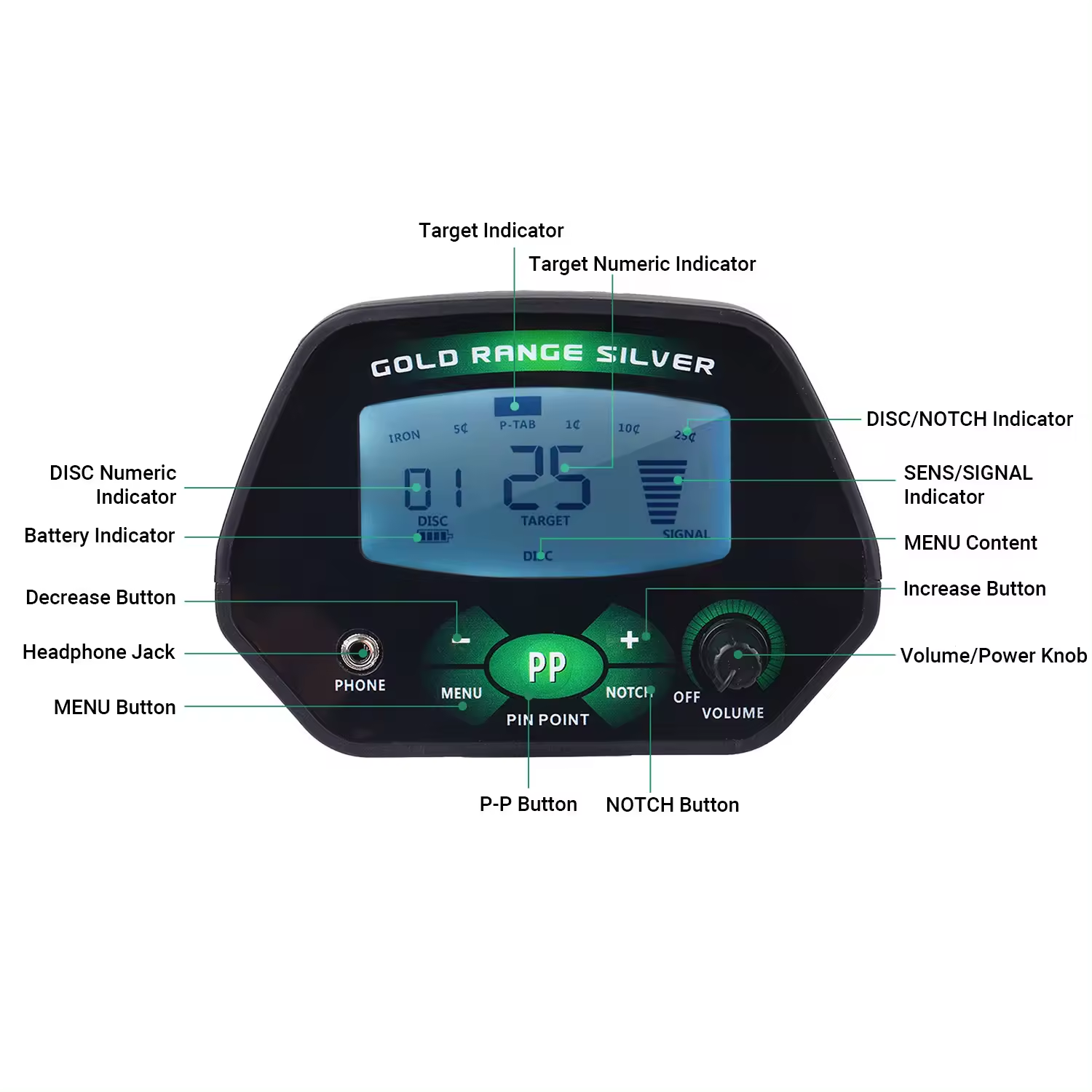 1. LCD Display: This intuitive LCD screen vividly displays possible metal types, the depth of your target, and the range settings for both disc and notch. Plus, monitor sensor levels and battery status effortlessly. With a digital readout, identifying your target has never been clearer.
