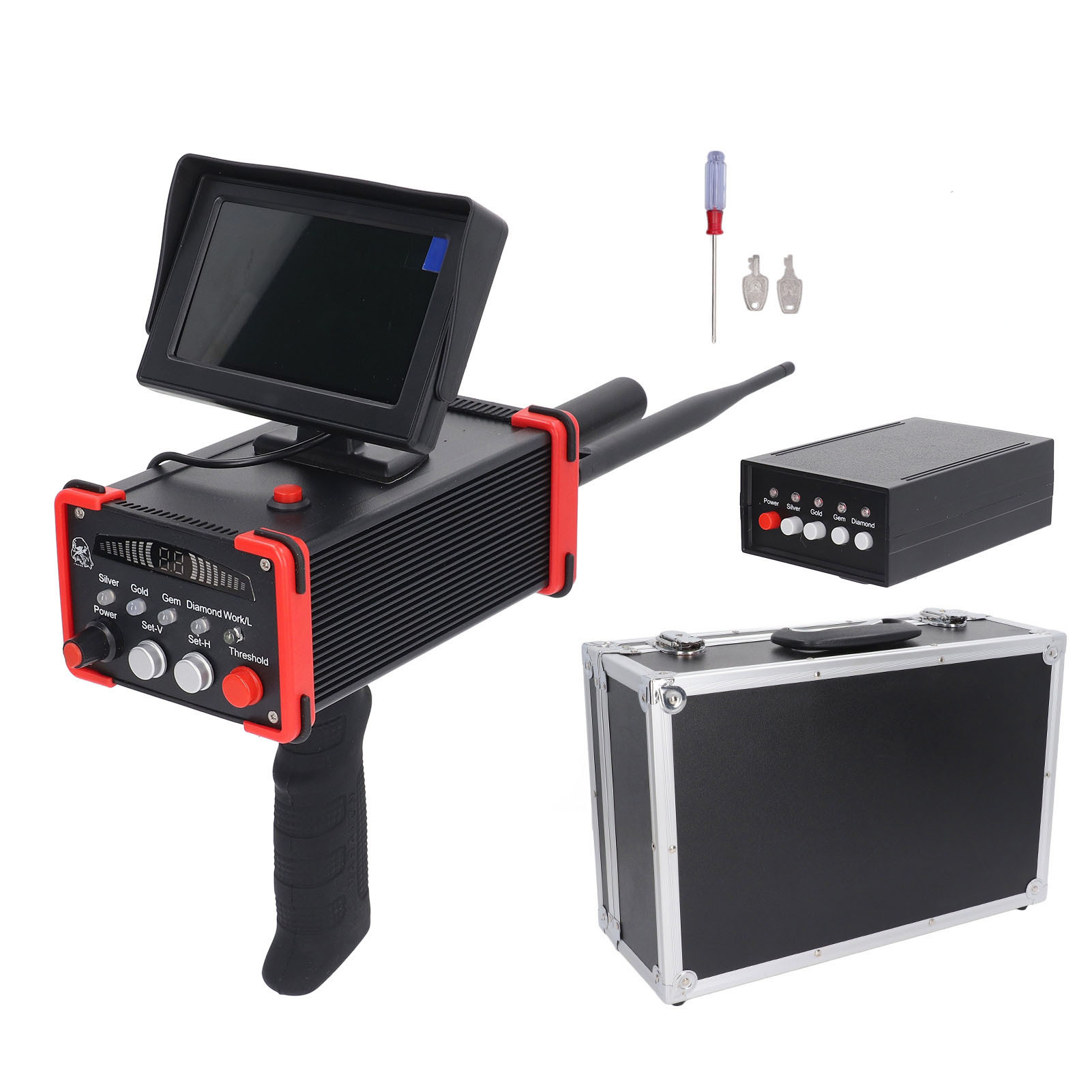 Search range: 1-100 meters Detection depth: 1-25 meters Battery: 12V Detection type: gold, silver, copper, gems Charging method: The instrument has been installed with a rechargeable battery, directly connected to the charger, it can be charged, and the charging time is 10-12 hours. Turn on the transmitter and receiver switches, and then press the button corresponding to the metal you are looking for (for example, gold, when gold is selected, the corresponding light on the receiver will be on, and the operation is the same for other metals); next, you can select Depth and search range, and finally, choose the speed of search (if the search range is small, it is recommended to select the slow search mode; if the range is wide, it is recommended to select the fast search mode).