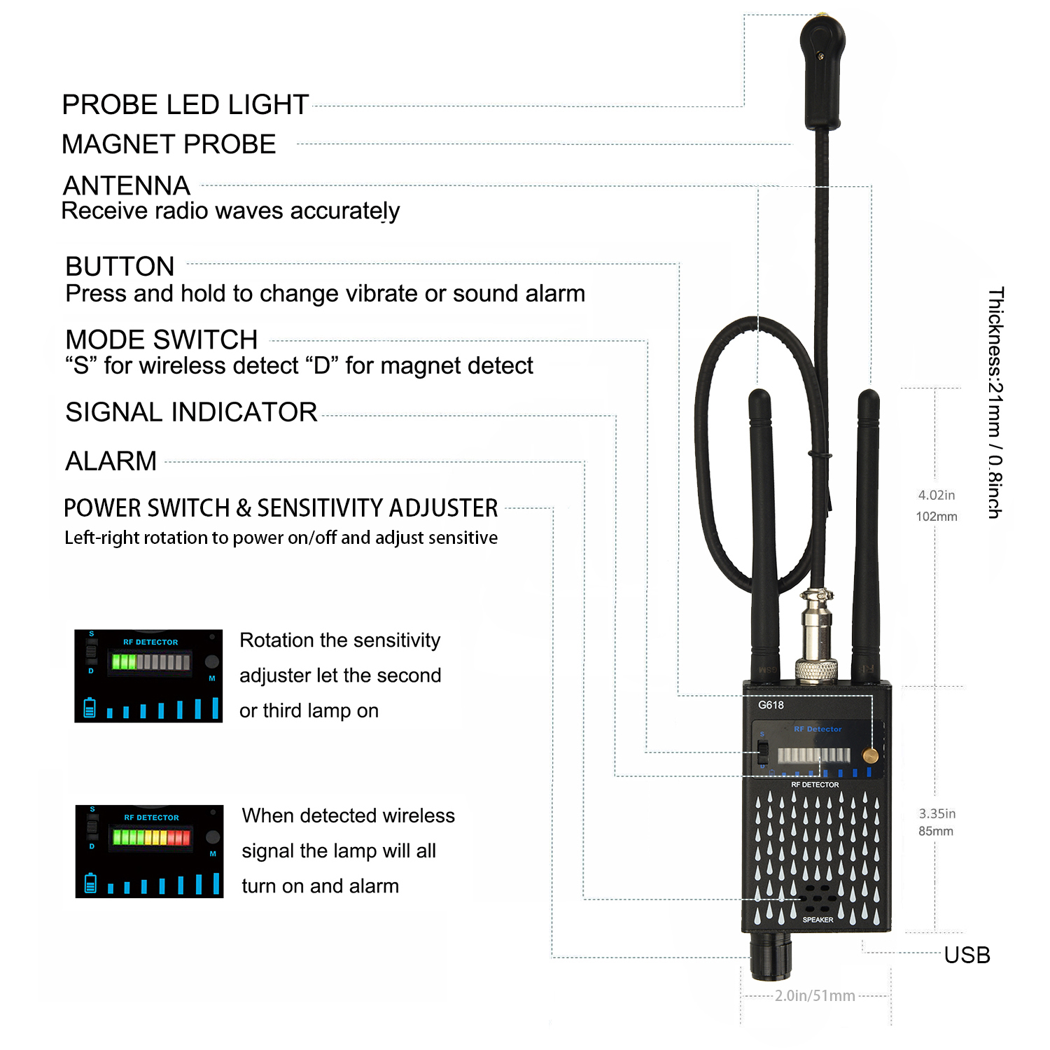 (1) Indicator Light:there is 10 level L ED light, the first to tenth is for detection instruction, if all lights flash, will produce beep" sound, the sound is more urgent, the signal is more strong.