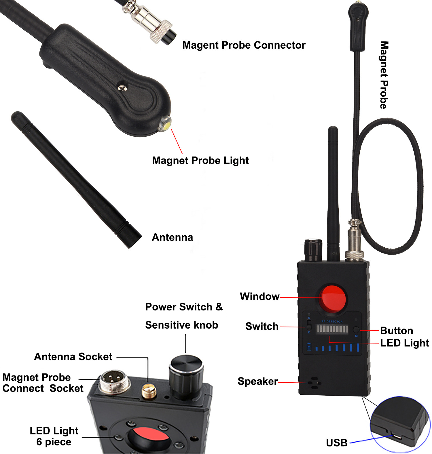 Explore the versatile world of this device with its remarkable three modes. The first mode scans wireless signals within the vast 1-8000GHz range, locating covert eavesdropping gadgets and *** cameras effortlessly. With the second mode, the detection probe swiftly identifies electromagnetic fields, revealing hidden trackers on your vehicle. The third mode dazzles with a detection window and six blinking LED lights, making even the smallest cameras visible with a distinct dot on the screen.
